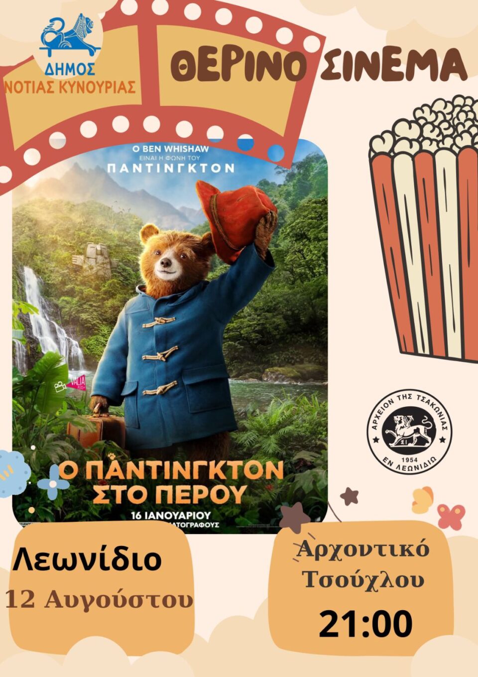 Ο Δήμος Νότιας Κυνουρίας και το Αρχείον Τσακωνιάς σας προσκαλούν απόψε, Δευτέρα 12 Αυγούστου, σε μια ξεχωριστή προβολή θερινού σινεμά με την αγαπημένη παιδική ταινία “Ο Πάντινγκτον στο Περού”!