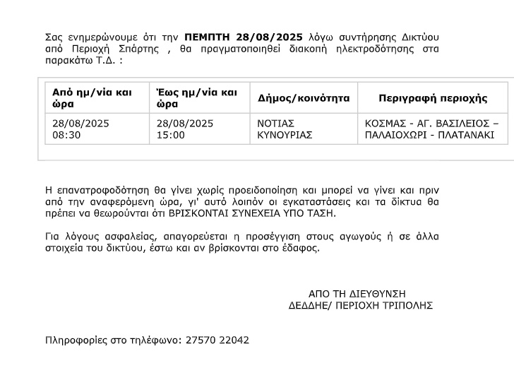 Χωρίς ηλεκτρικό ρεύμα θα μείνουν την Πέμπτη 28 Αυγούστου 2025 τέσσερις κοινότητες του Δήμου Νότιας Κυνουρίας, λόγω προγραμματισμένων εργασιών συντήρησης στο δίκτυο της ΔΕΔΔΗΕ από την περιοχή Σπάρτης.