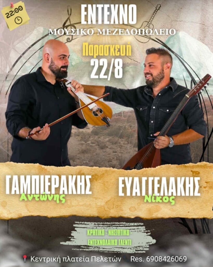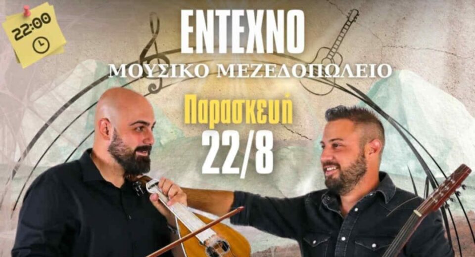 Μια βραδιά γεμάτη μουσική, χορό και κέφι υπόσχεται το Μουσικό Μεζεδοπωλείο «Έντεχνο», που διοργανώνει την Παρασκευή 22 Αυγούστου στις 22:00 ένα μοναδικό γλέντι στην κεντρική πλατεία Πελετών.