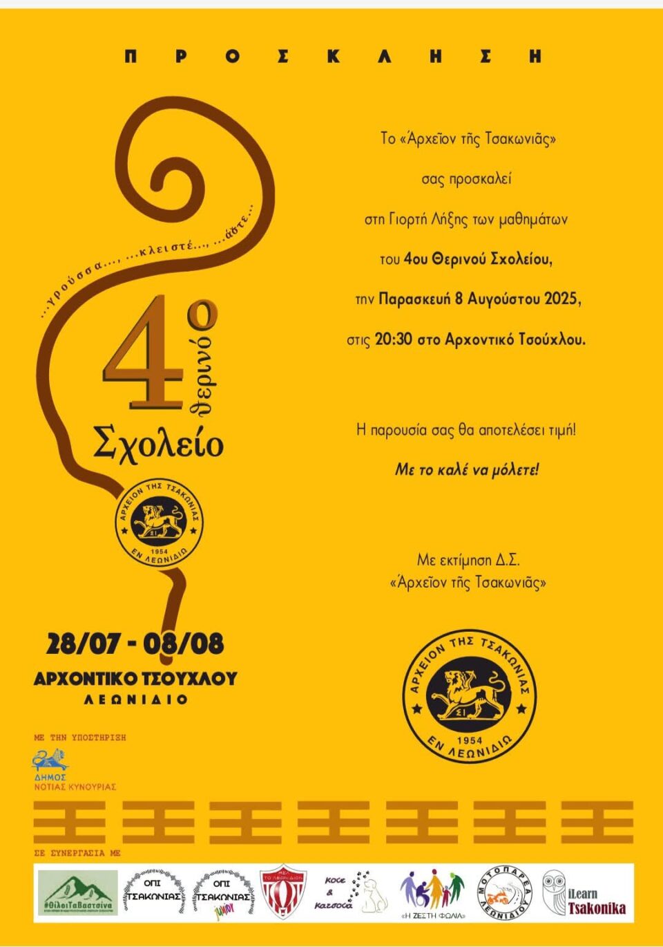 Σε μια ξεχωριστή εκδήλωση γεμάτη συγκίνηση, γέλιο και τσακώνικη ψυχή, το «Αρχείον της Τσακωνιάς» προσκαλεί μικρούς και μεγάλους στη Γιορτή Λήξης του 4ου Θερινού Σχολείου, την Παρασκευή 8 Αυγούστου 2025, στις 20:30 στο Αρχοντικό Τσούχλου στο Λεωνίδιο.