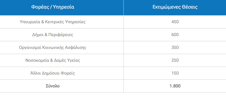 Οι θέσεις κατανέμονται σε υπουργεία, δημόσιους οργανισμούς, ασφαλιστικά ταμεία, δήμους και περιφέρειες. Ειδικό βάρος θα δοθεί σε υπηρεσίες πρώτης γραμμής, ώστε να ενισχυθεί η εξυπηρέτηση πολιτών και η λειτουργία του κοινωνικού κράτους.