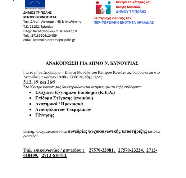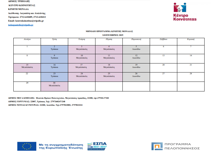 Ο Δήμος Τρίπολης, μέσω του Κέντρου Κοινότητας και της Κινητής Μονάδας, συνεχίζει και τον Σεπτέμβριο του 2025 να προσφέρει πολύτιμες κοινωνικές υπηρεσίες στους κατοίκους των απομακρυσμένων περιοχών της Αρκαδίας.