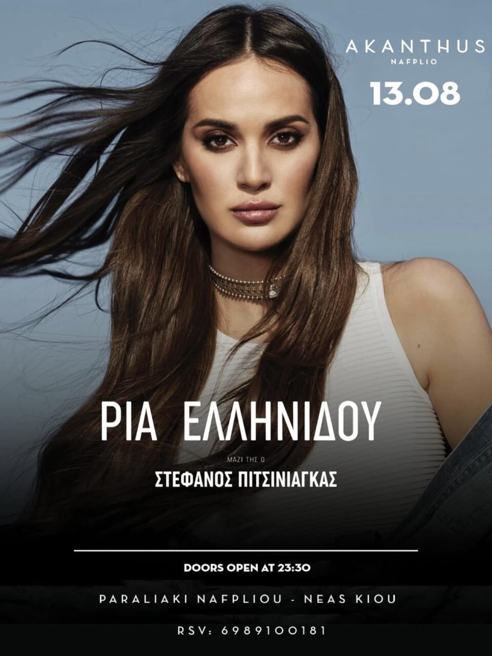 Η εντυπωσιακή Ρία Ελληνίδου ανεβαίνει στη σκηνή του Akanthus στο Ναύπλιο τη 13η Αυγούστου, για μια βραδιά γεμάτη μουσική, ενέργεια και καλοκαιρινό παλμό! Μαζί της θα εμφανιστεί και ο ταλαντούχος Στέφανος Πιτσινιάγκας, προσθέτοντας ακόμα περισσότερη λάμψη στη βραδιά.