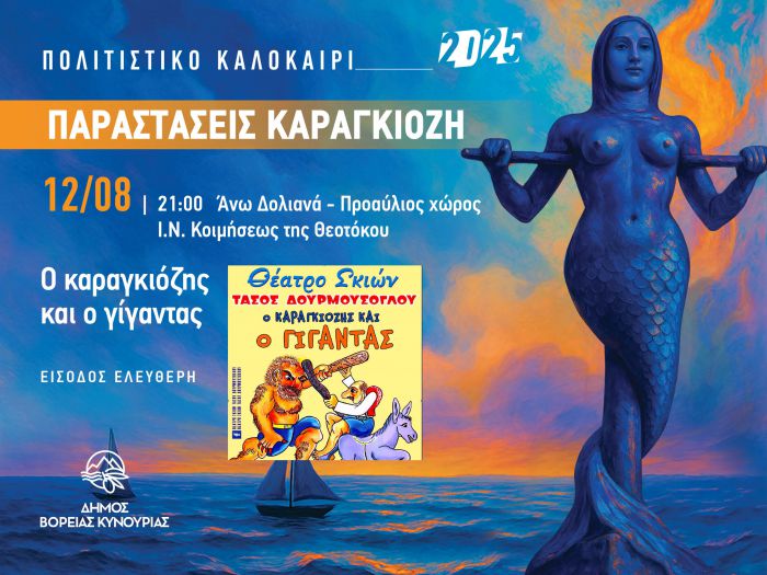 Ο προαύλιος χώρος του Ι.Ν. Κοιμήσεως της Θεοτόκου στα Άνω Δολιανά γεμίζει με φωνές και σκιές, την Τρίτη 12 Αυγούστου και ώρα 21:00 σε μια απολαυστική παράσταση θεάτρου σκιών «Ο καραγκιόζης και ο γίγαντας».