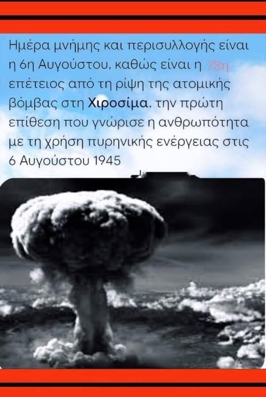 Η 6η Αυγούστου είναι ημέρα μνήμης και περισυλλογής. Σαν σήμερα, το 1945, η πόλη Χιροσίμα στην Ιαπωνία έγινε η πρώτη περιοχή στην ιστορία της ανθρωπότητας που δέχθηκε πυρηνική επίθεση.