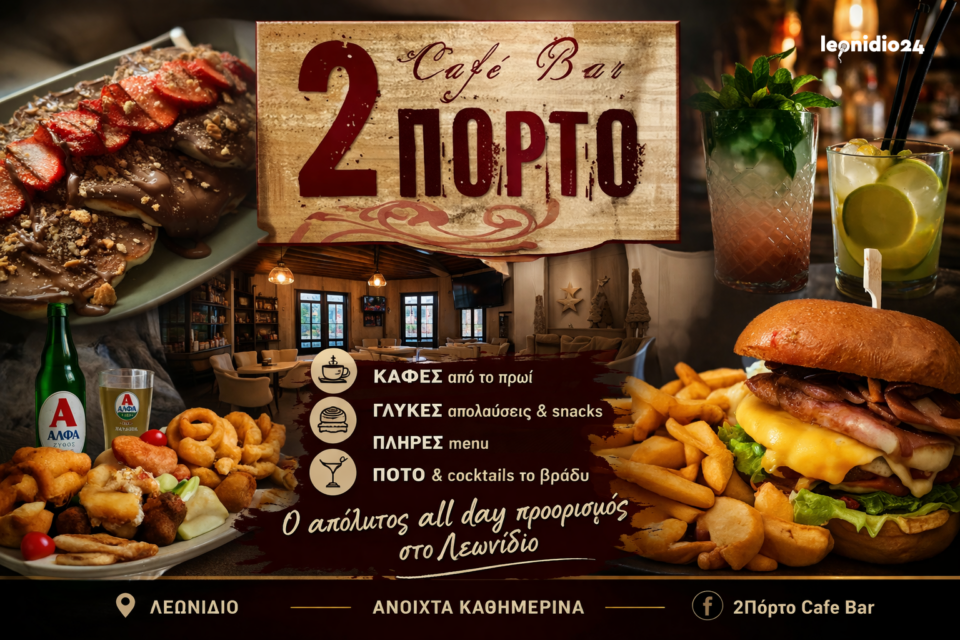 Το 2Πόρτο Cafe Bar αποτελεί έναν από τους σταθερούς προορισμούς στο Λεωνίδιο για καφέ, ποτό και στιγμές χαλάρωσης, όλες τις ώρες της ημέρας.