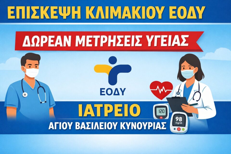 Ενημερώνουμε τους κατοίκους της Κοινότητας Αγίου Βασιλείου ότι κλιμάκιο του ΕΟΔΥ από τον Νομό Αρκαδίας θα επισκεφθεί την κοινότητά μας την Τετάρτη 14/1/2026 και ώρα 10:30 π.μ., στο Ιατρείο του χωριού.