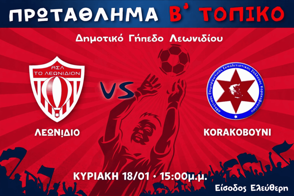 Στο πλαίσιο του Πρωταθλήματος Β’ Τοπικού, η ομάδα του Λεωνιδίου υποδέχεται το Κορακοβούνι την Κυριακή 18 Ιανουαρίου, στις 15:00, στο Δημοτικό Γήπεδο Λεωνιδίου.