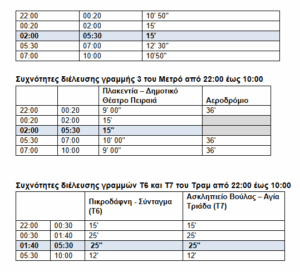 Όπως επισημαίνεται σε ανακοίνωση του Υπουργείου Υποδομών και Μεταφορών: «Ο ΟΑΣΑ καθιερώνει πλέον σε σταθερή βάση τη λειτουργία του Μετρό (γραμμές 2 και 3), του Τραμ (γραμμές Τ6 και Τ7) καθώς και επιλεγμένων λεωφορειακών γραμμών σε 24ωρη βάση, καλύπτοντας νευραλγικά σημεία του λεκανοπεδίου.