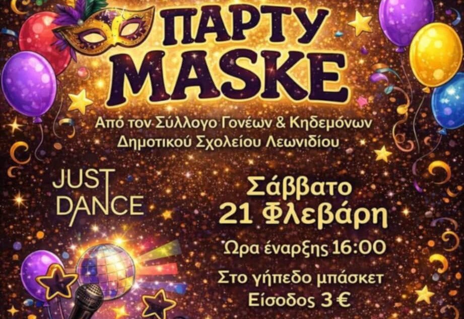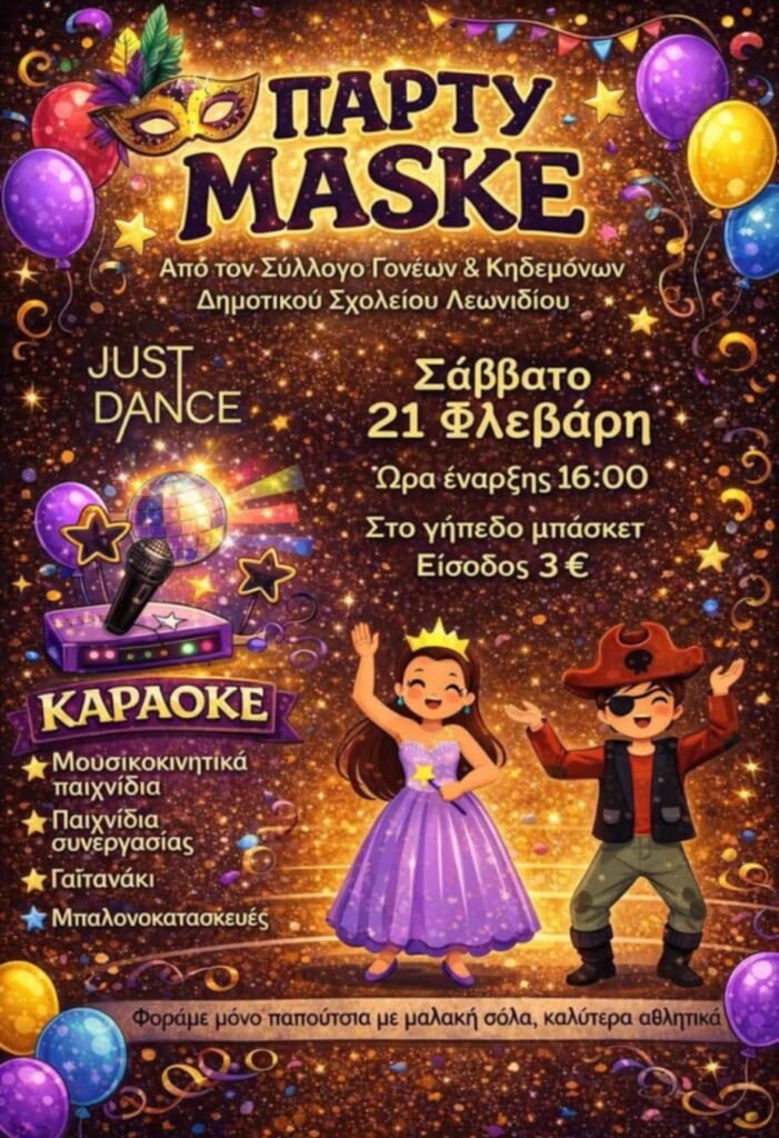 Ο Σύλλογος Γονέων και Κηδεμόνων του Δημοτικού Σχολείου Λεωνιδίου διοργανώνει αποκριάτικο πάρτι μασκέ το Σάββατο 21 Φεβρουαρίου, προσκαλώντας μικρούς και μεγάλους σε μια γιορτή γεμάτη μουσική, παιχνίδι και διασκέδαση.