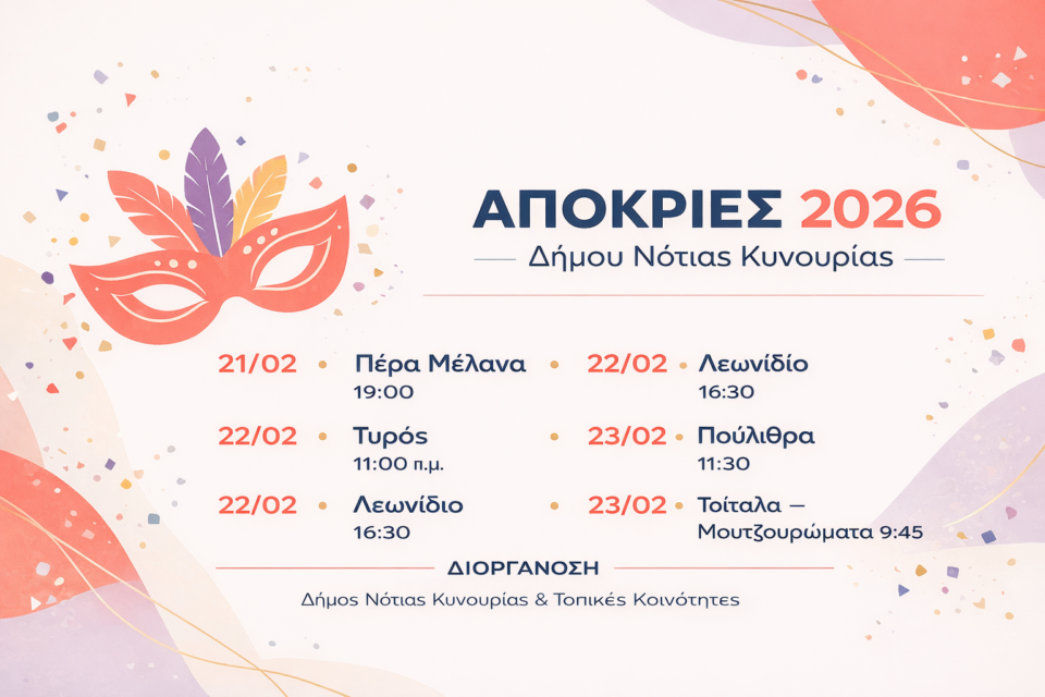 Με πλούσιο πρόγραμμα εκδηλώσεων γιορτάζονται οι Αποκριές 2026 στον Δήμο Νότιας Κυνουρίας, με δράσεις σε Τυρό, Πέρα Μέλανα, Λεωνίδιο, Πούλιθρα και Τσιτάλια.