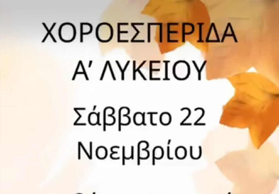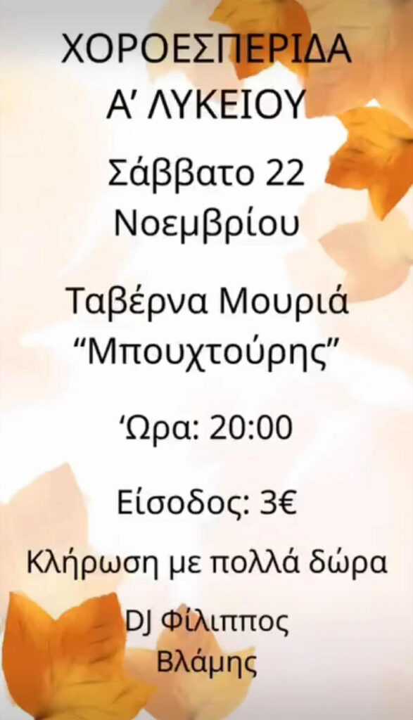 Η χοροεσπερίδα του Α’ Λυκείου θα πραγματοποιηθεί το Σάββατο 22 Νοεμβρίου στην ταβέρνα «Μουριά – Μπουχτούρης». Η εκδήλωση θα ξεκινήσει στις 20:00, με είσοδο 3 ευρώ.
