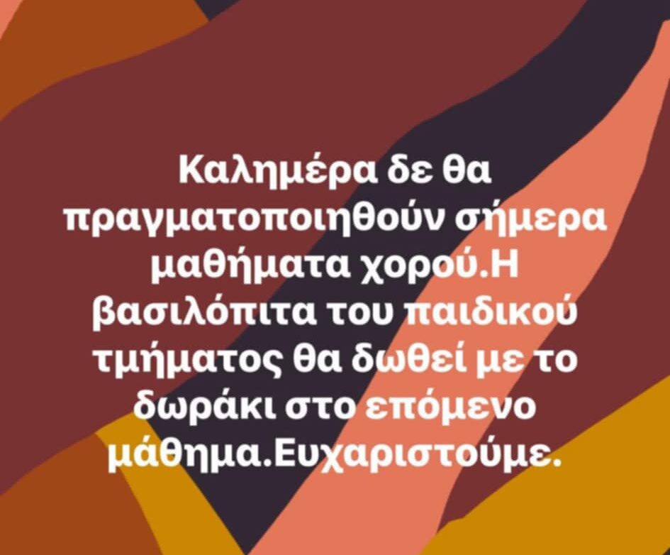 Όπως ανακοινώθηκε, η βασιλόπιτα του παιδικού τμήματος, μαζί με το καθιερωμένο δωράκι, θα δοθεί στο επόμενο προγραμματισμένο μάθημα.