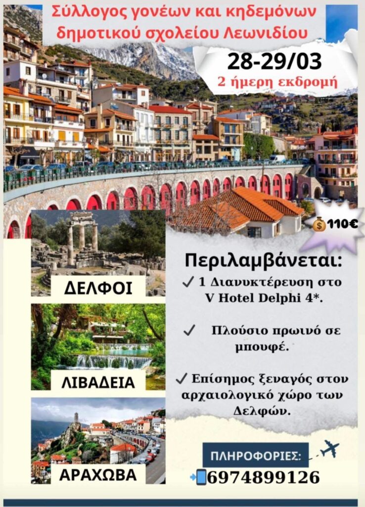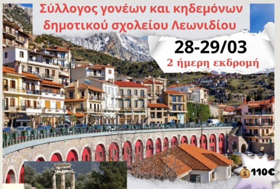 Ο Σύλλογος Γονέων και Κηδεμόνων του Δημοτικού Σχολείου Λεωνιδίου διοργανώνει διήμερη εκπαιδευτική και πολιτιστική εκδρομή στις 28–29 Μαρτίου, με προορισμούς τους Δελφούς, τη Λιβαδειά και την Αράχωβα.