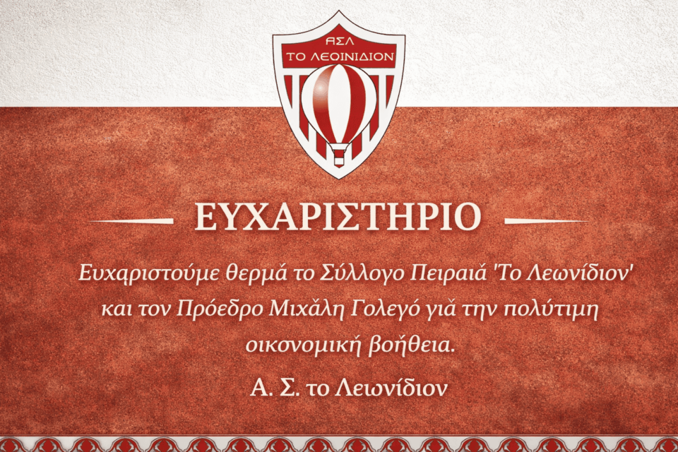 Ο Αθλητικός Σύλλογος Λεωνιδίου εκφράζει τις θερμές του ευχαριστίες προς τον Σύλλογο Πειραιά «Το Λεωνίδιον», τα μέλη του Διοικητικού Συμβουλίου και ιδιαίτερα τον Πρόεδρο του Δ.Σ., κ. Μιχάλη Γολεγό, για την πολύτιμη οικονομική βοήθεια που προσέφεραν στον σύλλογό μας.