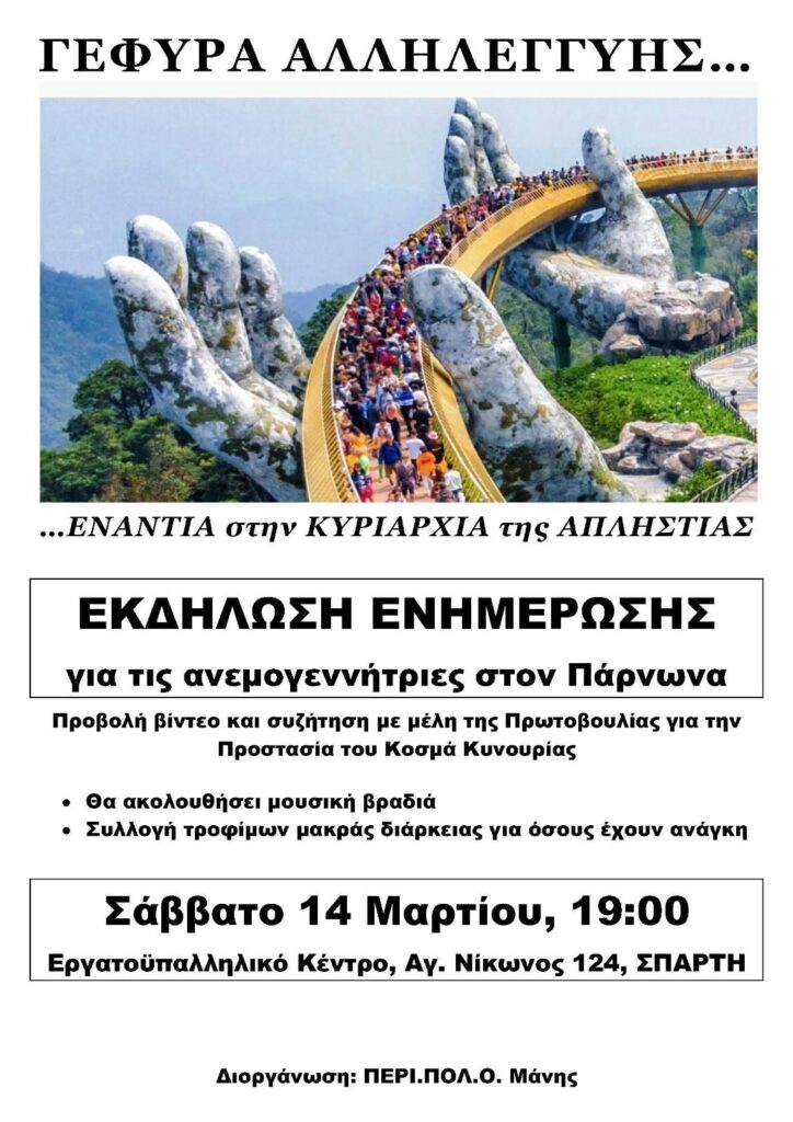 Εκδήλωση ενημέρωσης και συζήτησης για το ζήτημα της εγκατάστασης ανεμογεννητριών στον Πάρνωνα διοργανώνεται το Σάββατο 14 Μαρτίου στις 19:00, στο Εργατοϋπαλληλικό Κέντρο Σπάρτης (Αγίου Νίκωνος 124).