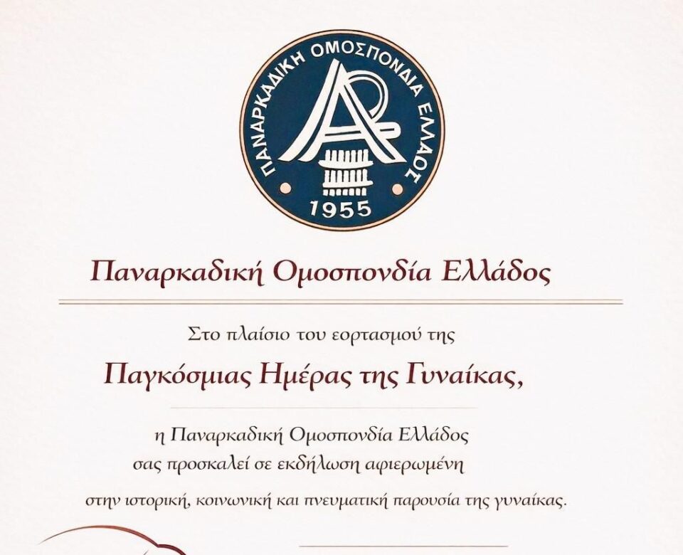 Η Παναρκαδική Ομοσπονδία Ελλάδος διοργανώνει εκδήλωση στο πλαίσιο του εορτασμού της Παγκόσμιας Ημέρας της Γυναίκας, αφιερωμένη στην ιστορική, κοινωνική και πνευματική παρουσία της γυναίκας.