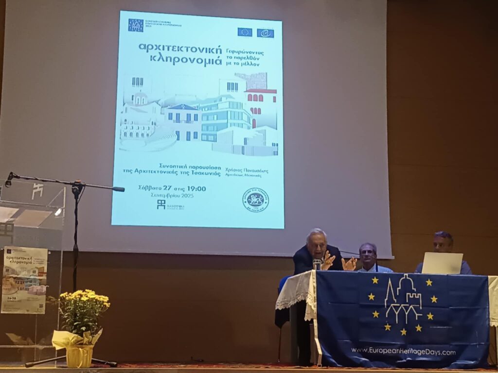 Κεντρικός ομιλητής ήταν ο αρχιτέκτονας – μηχανικός Χρήστος Πανουσάκης , ο οποίος παρουσίασε με γλαφυρό τρόπο τα ιδιαίτερα χαρακτηριστικά και τη σημασία της τσακώνικης αρχιτεκτονικής στο πέρασμα του χρόνου, στο πλαίσιο των Ευρωπαϊκών Ημερών Πολιτιστικής Κληρονομιάς 2025.
