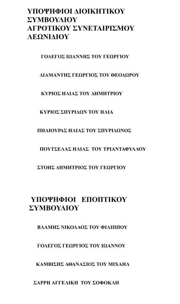 «Εκλογές στον Αγροτικό Συνεταιρισμό Λεωνιδίου «Ο Άγιος Λεωνίδας»- Υποψηφιότητες »