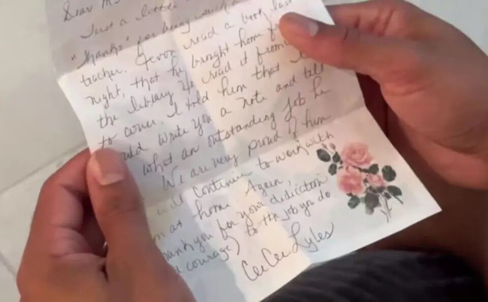 «Αγαπητή κυρία Thurman, ο Jevon διάβασε χθες το βράδυ ένα βιβλίο που έφερε στο σπίτι από τη βιβλιοθήκη. Το διάβασε από την αρχή μέχρι το τέλος. Του είπα ότι θα σας έγραφα ένα σημείωμα για να σας πω πόσο εξαιρετική δουλειά έκανε. Είμαστε πολύ περήφανοι για αυτόν και θα συνεχίσουμε να δουλεύουμε μαζί του στο σπίτι. Και πάλι, σας ευχαριστούμε για την αφοσίωση και το θάρρος που επιδεικνύετε στη δουλειά σας. Cee Cee Lyles», διάβασε συγκινημένος ο Castrillo στο WPTV.