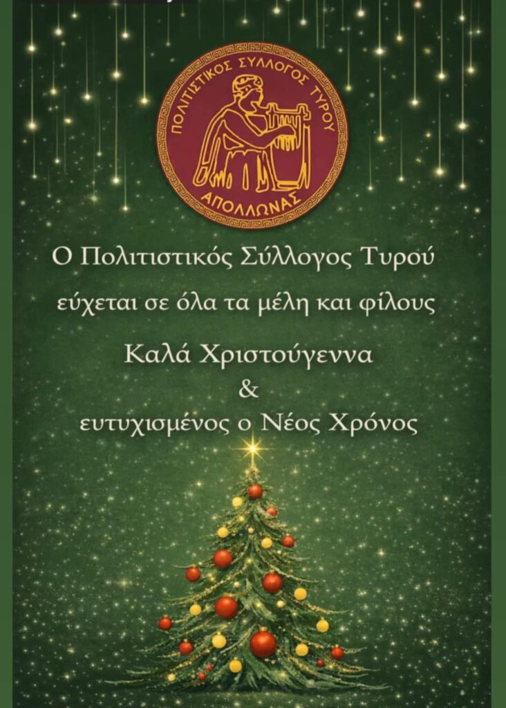 Με την ευκαιρία των άγιων ημερών των Χριστουγέννων και του ερχομού του νέου έτους, ο Πολιτιστικός Σύλλογος Τυρού «Ο Απόλλωνας» στέλνει τις πιο θερμές του ευχές προς όλο τον κόσμο.
