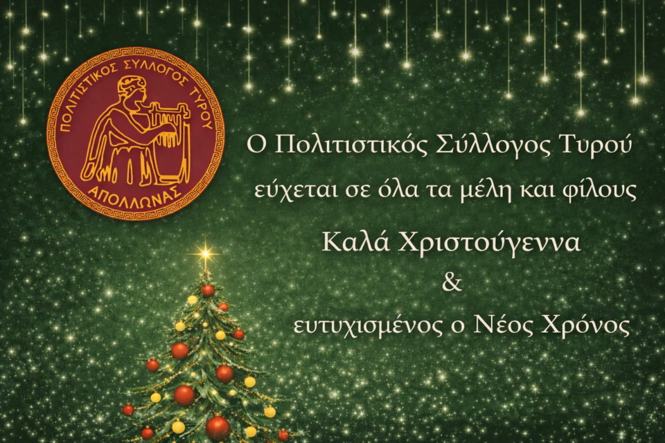 Με την ευκαιρία των άγιων ημερών των Χριστουγέννων και του ερχομού του νέου έτους, ο Πολιτιστικός Σύλλογος Τυρού «Ο Απόλλωνας» στέλνει τις πιο θερμές του ευχές προς όλο τον κόσμο.