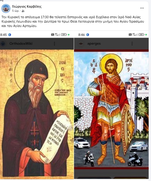 Την Κυριακή το απόγευμα 17:30 θα τελεστεί Εσπερινός και ιερό Ευχέλαιο στον Ιερό Ναό Αγίας Κυριακής Λεωνιδίου και την Δευτέρα το πρωί Θεία Λειτουργία στην μνήμη του Αγίου Γερασίμου και του Αγίου Αρτεμίου.
