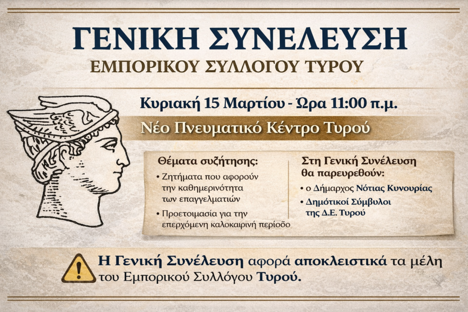 Η Γενική Συνέλευση αφορά τα μέλη του Εμπορικού Συλλόγου Τυρού.