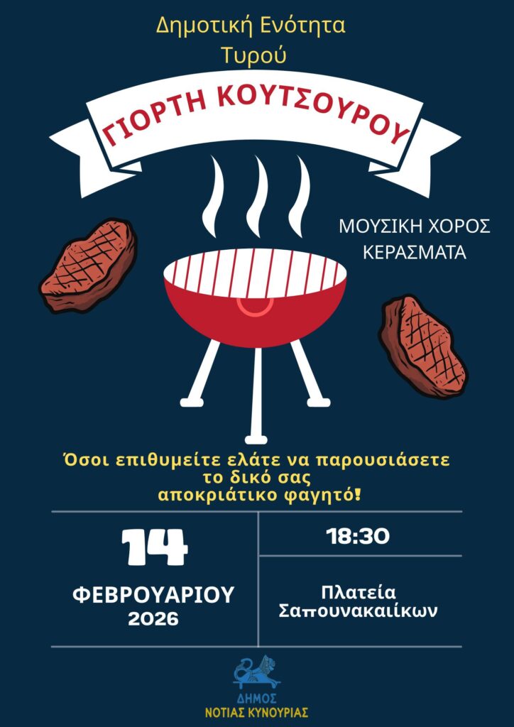 Ο Δήμος Νότιας Κυνουρίας διοργανώνει τη Γιορτή Κούτσουρου το Σάββατο 14 Φεβρουαρίου 2026, στις 18:30, στην πλατεία Σαπουνακαΐκων, στη Δημοτική Ενότητα Τυρού.