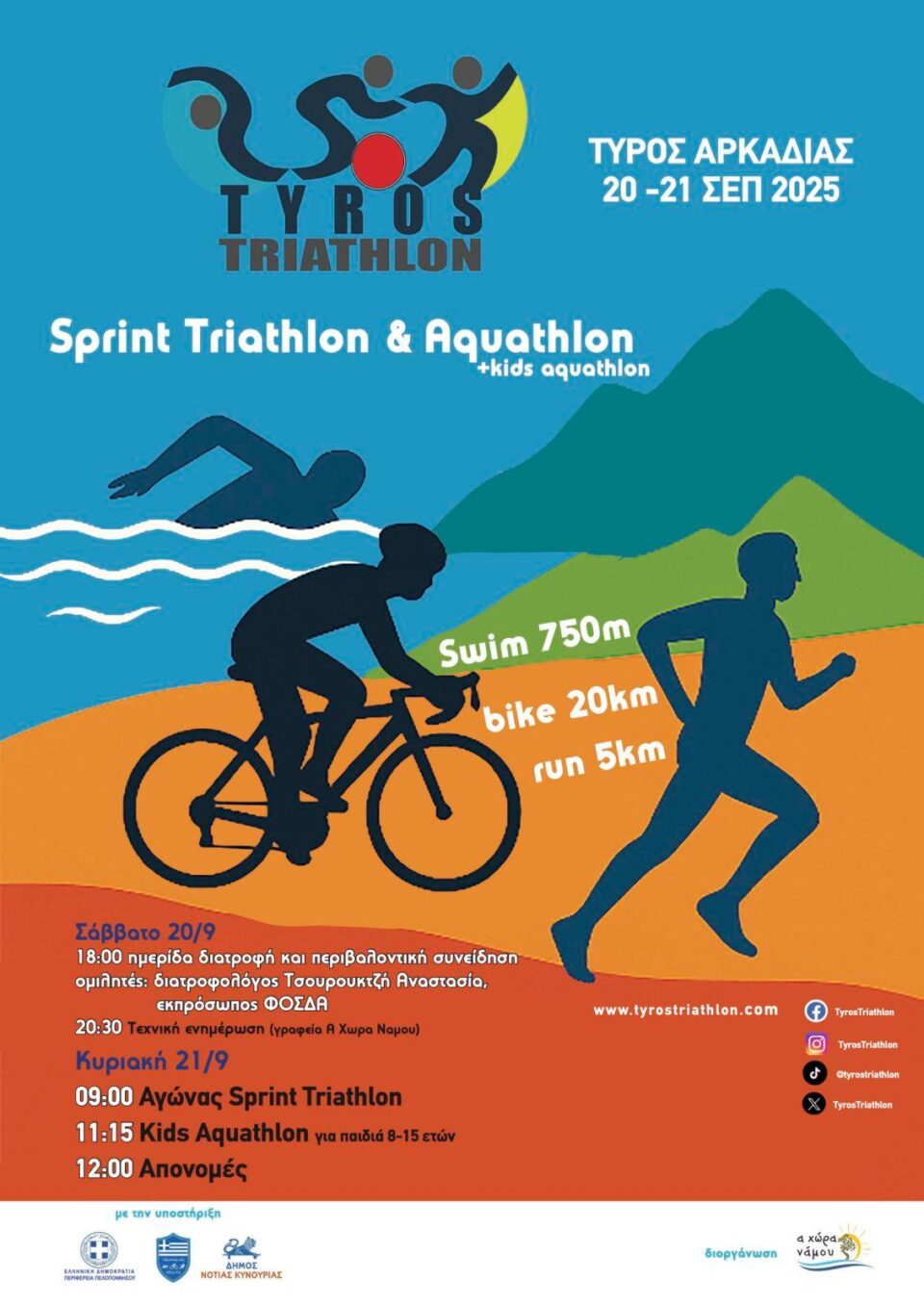 Το Σαββατοκύριακο 20-21 Σεπτεμβρίου, ο Τυρός Αρκαδίας στην μαγευτική Κυνουρία γεμίζει ενέργεια και αθλητικό πνεύμα! Ετοιμαστείτε για μια μοναδική εμπειρία γεμάτη κολύμβηση, ποδηλασία και τρέξιμο, με φόντο το υπέροχο τοπίο της περιοχής.