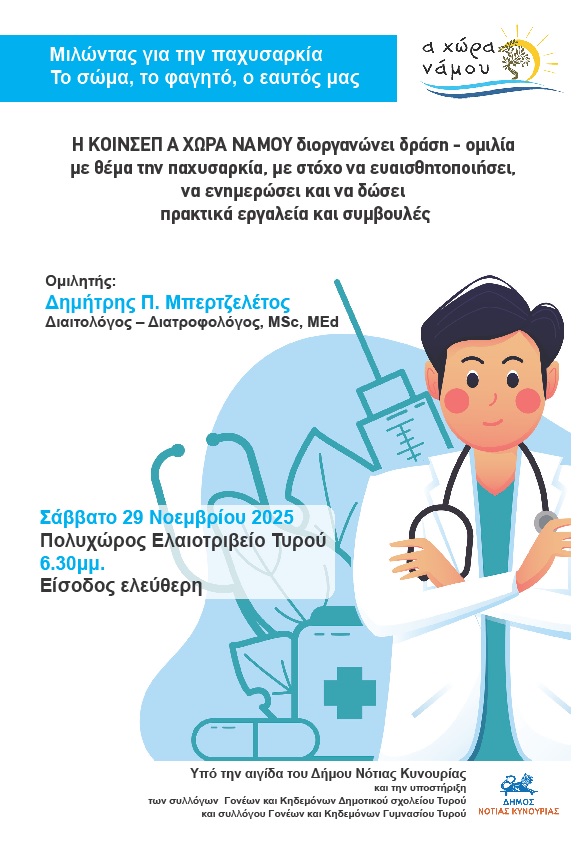 Η ΚΟΙΝΣΕΠ «Α ΧΩΡΑ ΝΑΜΟΥ» διοργανώνει μια απλή και κατανοητή δράση για την παχυσαρκία, με στόχο την ενημέρωση και την πρακτική καθοδήγηση γύρω από το σώμα, το φαγητό και τον εαυτό μας.