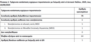 Συνολικά, έως τις 10 Σεπτεμβρίου, έχουν διαγνωστεί και διερευνηθεί 75 εγχώρια κρούσματα λοίμωξης από τον ιό του Δυτικού Νείλου στην Ελλάδα και πέντε θάνατοι. Οι ασθενείς που πέθαναν ήταν από 72 έως 86 ετών.