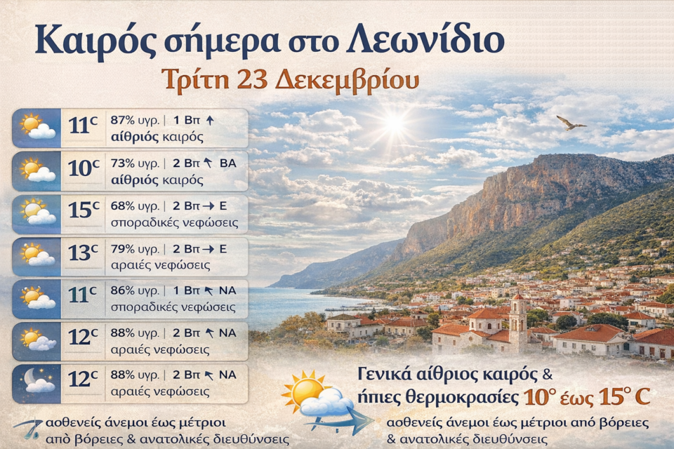 Με γενικά αίθριο καιρό και ήπιες θερμοκρασίες θα κυλήσει η σημερινή ημέρα στο Λεωνίδιο. Από τις πρωινές ώρες επικρατεί καθαρός ουρανός, με τους ανέμους να πνέουν ασθενείς έως μέτριοι, κυρίως από βόρειες και ανατολικές διευθύνσεις.