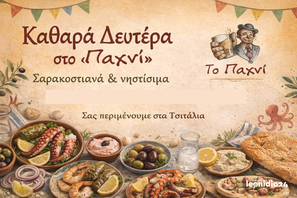 Την Καθαρά Δευτέρα, το «Παχνί» σας περιμένει με πλούσιο μενού από νηστίσιμα και σαρακοστιανά πιάτα. Παραδοσιακές γεύσεις, θαλασσινά, φρέσκες σαλάτες και λαγάνα θα συνθέσουν το τραπέζι της ημέρας, σε ζεστή και φιλική ατμόσφαιρα.