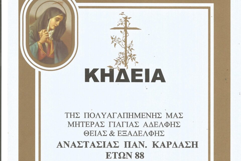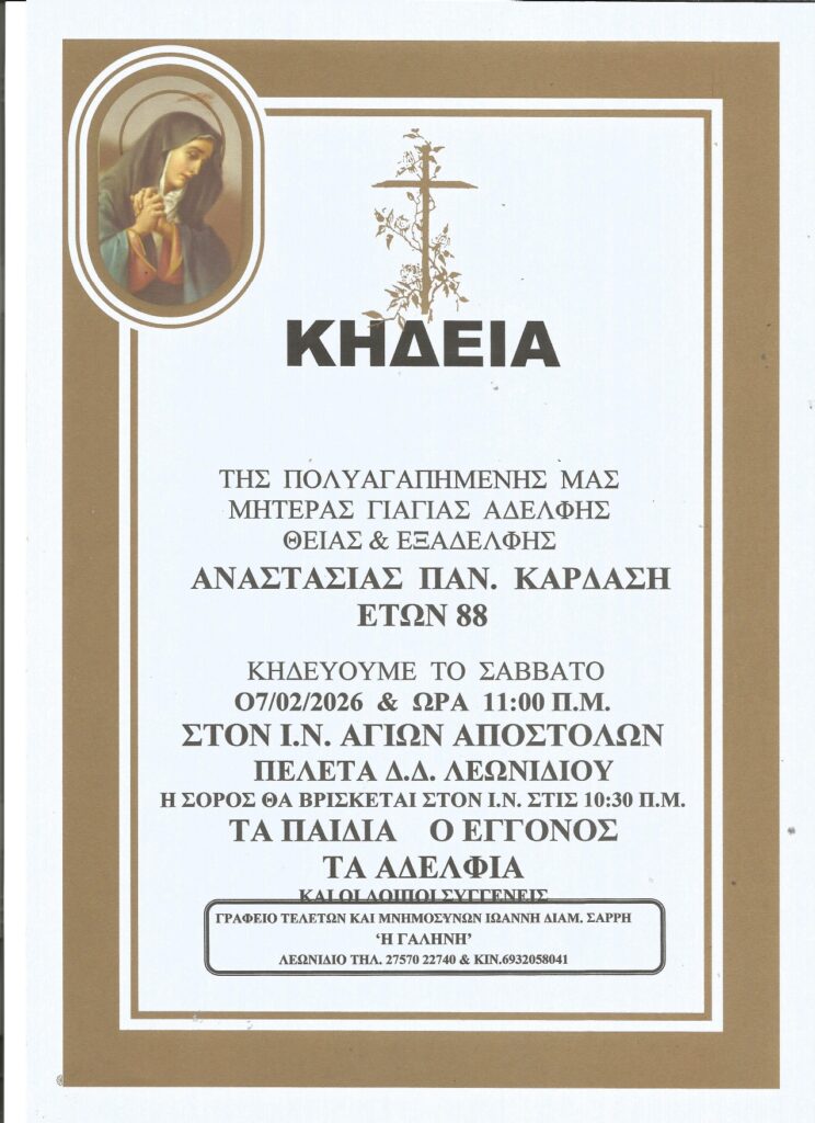 Τo Σάββατο 7 Φεβρουαρίου 2026 και ώρα 11:00 π.μ. θα τελεστεί η κηδεία της Αναστασίας Παν. Καρδάση, ετών 88, στον Ιερό Ναό Αγίων Αποστόλων Πελέτα, Δήμου Δ.Ε. Λεωνιδίου.