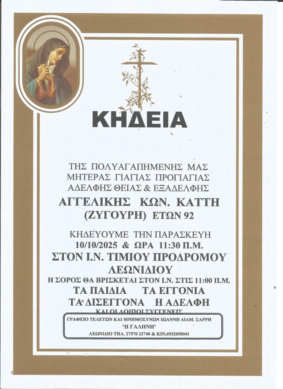 Η εξόδιος ακολουθία θα τελεστεί την Παρασκευή 10 Οκτωβρίου 2025 και ώρα 11:30 π.μ. στον Ιερό Ναό Τιμίου Προδρόμου Λεωνιδίου. Η σορός θα βρίσκεται στον ναό από τις 11:00 π.μ. για τον τελευταίο αποχαιρετισμό.