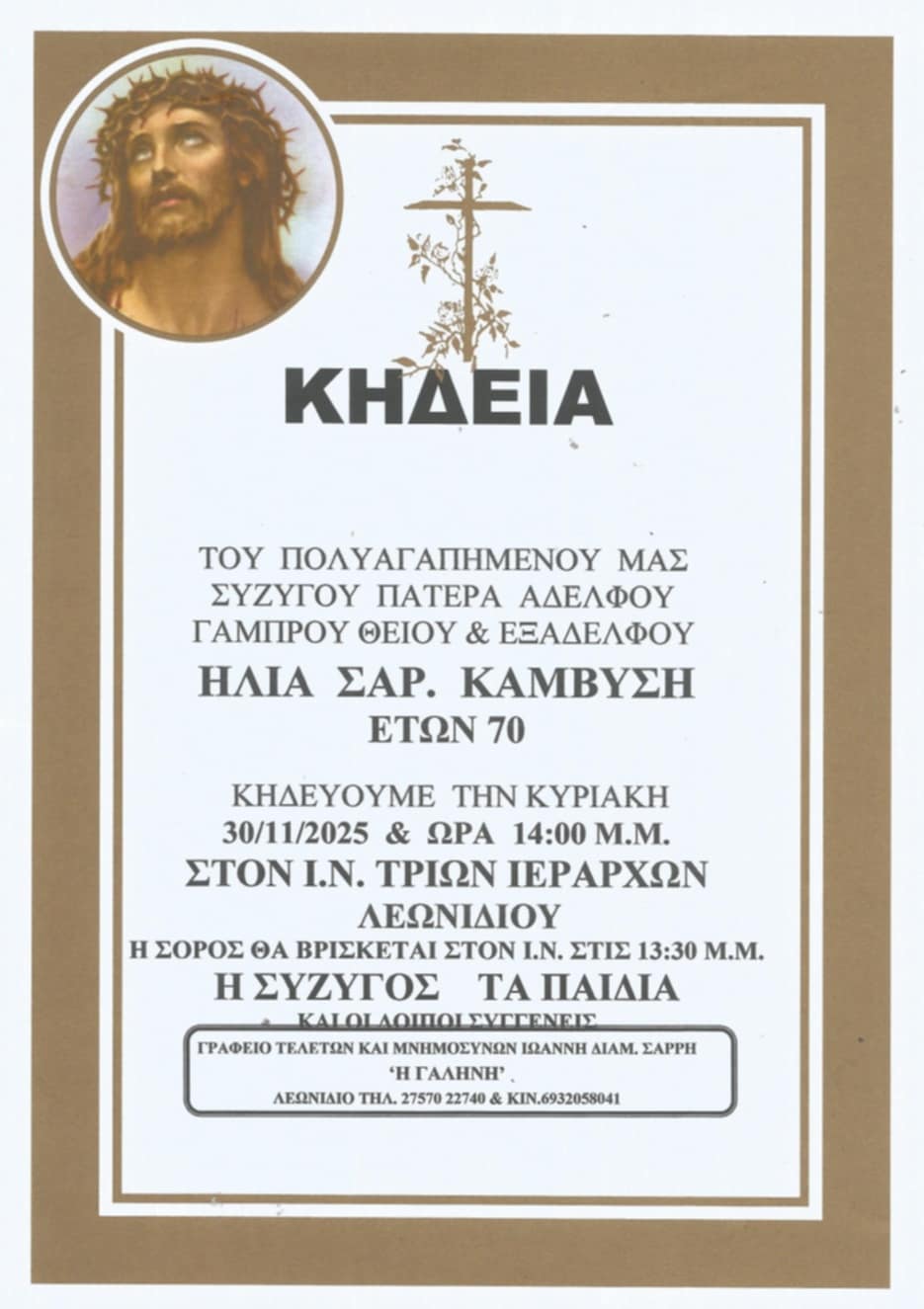 Ηλία Σαρ. Καμβύση (ετών 70), κηδεύουμε την Κυριακή 30 Νοεμβρίου 2025 και ώρα 14:00 μ.μ.