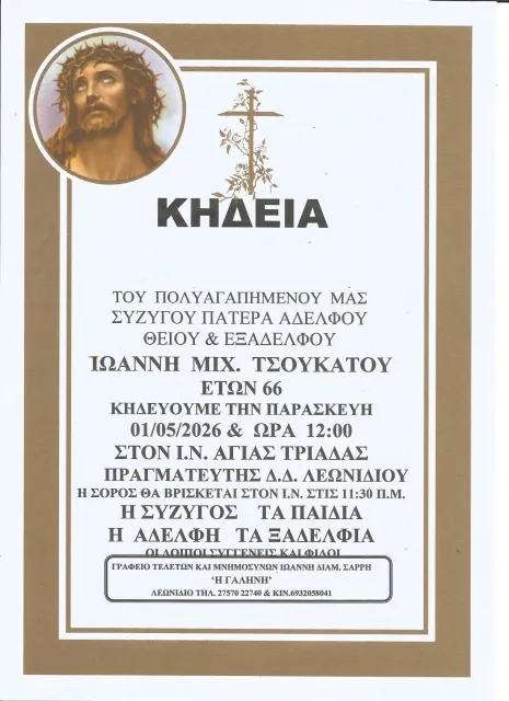 Τον πολυαγαπημένο μας Ιωάννη Μιχ. τσουκάτο, ετών 66, κηδεύουμε την Παρασκευή 1η Μαΐου 2026 και ώρα 12 μ. από τον Ιερό Ναό Αγίας τριάδας Πραγματευτής Λεωνιδίου.