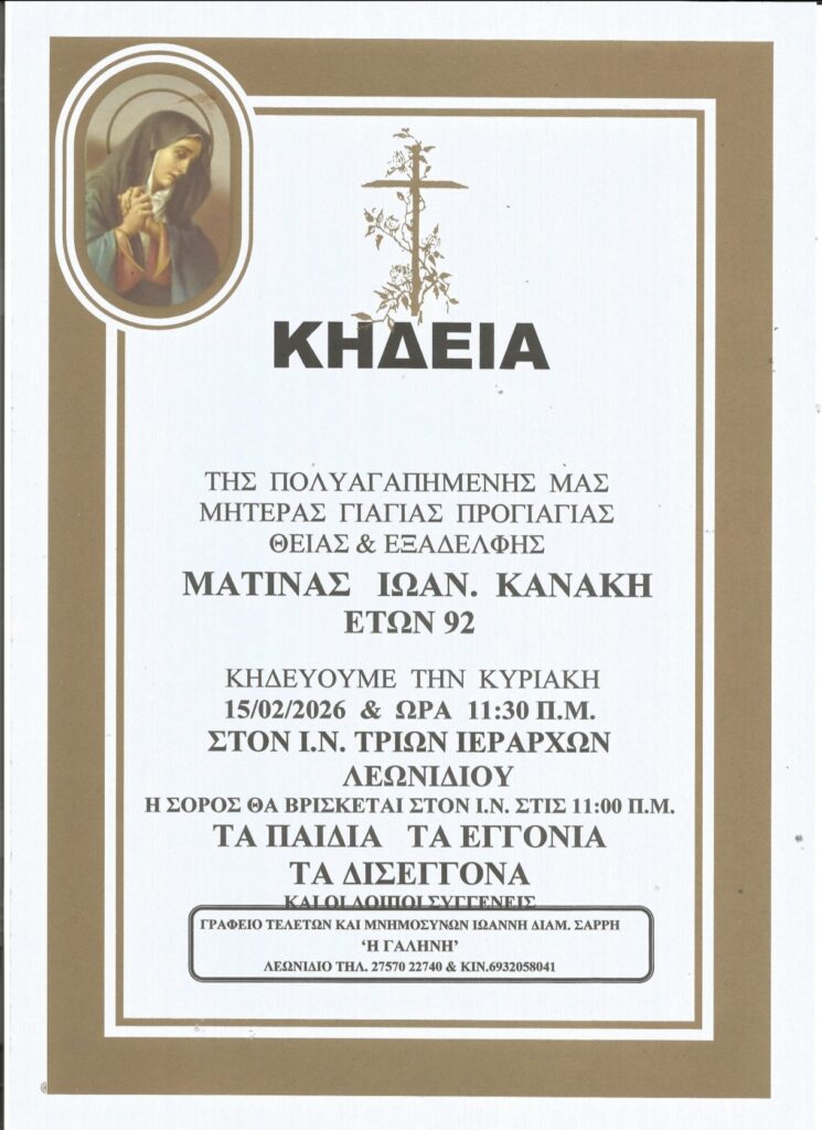 Η εξόδιος ακολουθία θα τελεστεί στο Λεωνίδιο, με το ακόλουθο πρόγραμμα:
