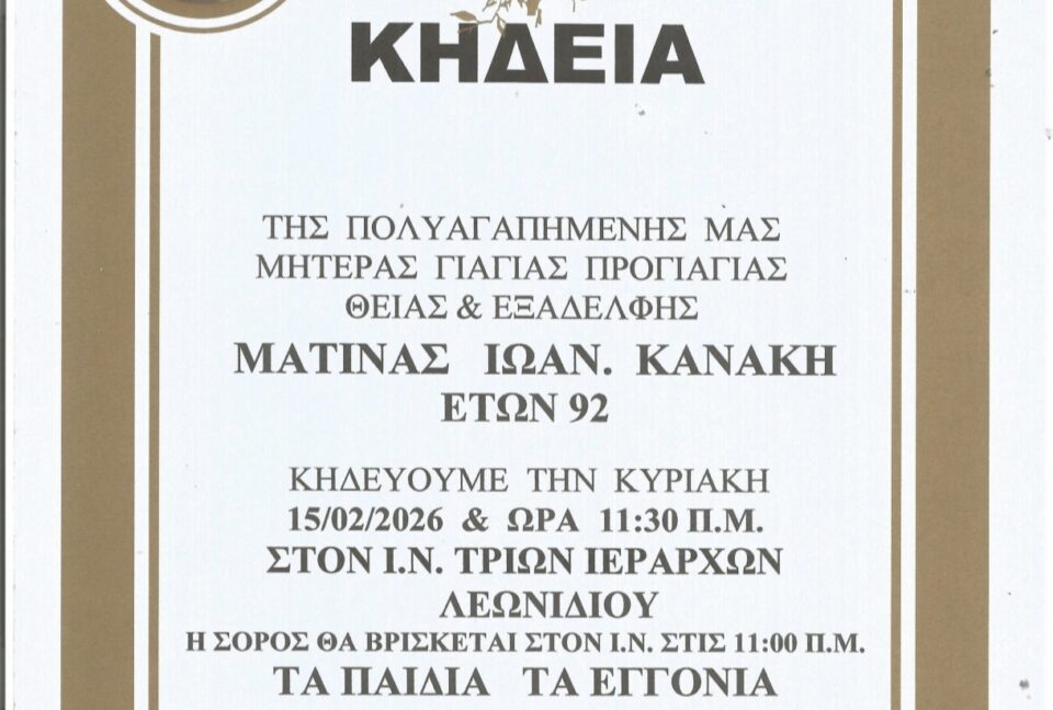 Προσέλευση: Η σορός θα βρίσκεται στον Ιερό Ναό από τις 11:00 π.μ. για το τελευταίο αντίο.