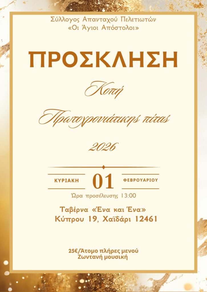 Ο Σύλλογος Πελετών «Άγιοι Απόστολοι» προσκαλεί τα μέλη και τους φίλους του στην κοπή της πρωτοχρονιάτικης πίτας, η οποία θα πραγματοποιηθεί την Κυριακή 1 Φεβρουαρίου στην ταβέρνα «Ένα και Ένα» στο Χαϊδάρι, με ώρα προσέλευσης 13:00.
