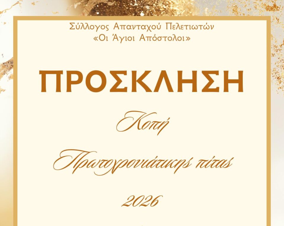 Ο Σύλλογος Πελετών «Άγιοι Απόστολοι» προσκαλεί τα μέλη και τους φίλους του στην κοπή της πρωτοχρονιάτικης πίτας, η οποία θα πραγματοποιηθεί την Κυριακή 1 Φεβρουαρίου στην ταβέρνα «Ένα και Ένα» στο Χαϊδάρι, με ώρα προσέλευσης 13:00.