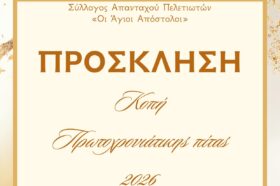 Κοινοποίηση🕒 17:31Ο Σύλλογος Πελετών «Άγιοι Απόστολοι» προσκαλεί τα μέλη και τους φίλους του στην κοπή της πρωτοχρονιάτικης πίτας, η οποία θα πραγματοποιηθεί την Κυριακή 1 Φεβρουαρίου στην ταβέρνα «Ένα και Ένα» στο Χαϊδάρι, με ώρα προσέλευσης 13:00. Η εκδήλωση θα πραγματοποιηθεί σε εορταστικό κλίμα, με πλήρες μενού και ζωντανή μουσική, … Continue reading Κοπή πρωτοχρονιάτικης πίτας στην Αθήνα από τον Σύλλογο Πελετών «Άγιοι Απόστολοι»