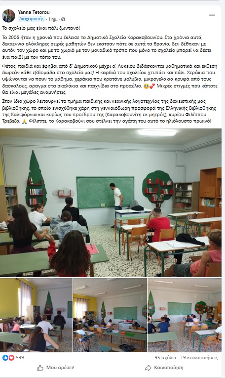 Στον ίδιο χώρο λειτουργεί το τμήμα παιδικής και νεανικής λογοτεχνίας της δανειστικής μας βιβλιοθήκης, το οποίο ενισχύθηκε χάρη στη γενναιόδωρη προσφορά της Ελληνικής Βιβλιοθήκης της Καλιφόρνια και κυρίως του προέδρου της (Καρακοβουνίτη εκ μητρός), κυρίου Φιλίππου Τρεβεζά. Φίλιππε, το Καρακοβούνι σου στέλνει την αγάπη του αυτό το ηλιόλουστο πρωινό!