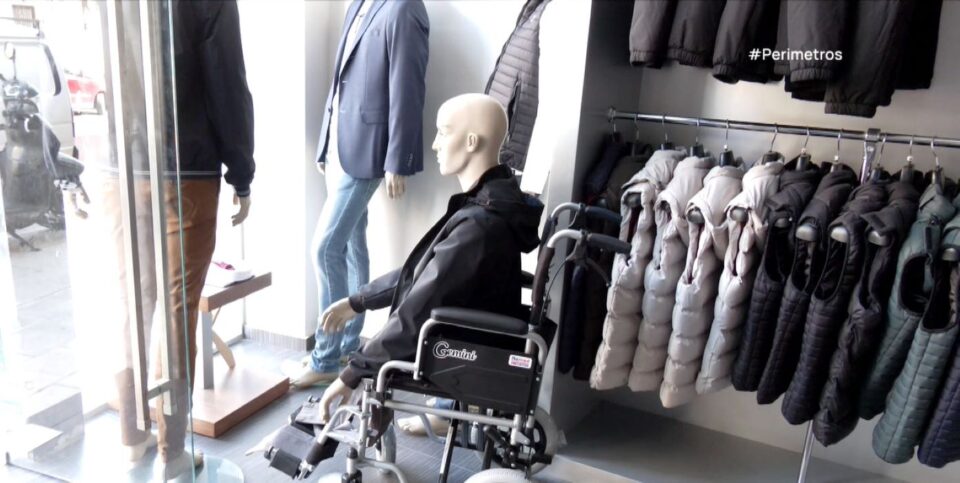 Εκεί που πέφτουν τα φώτα της προβολής μιας βιτρίνας δίπλα σε σε ρούχα, παπούτσια και είδη της καθημερινότητας, οι περαστικοί βλέπουν και αναπηρικά αμαξίδια. Μια κούκλα υπενθυμίζει ότι τα άτομα που βρίσκονται στα αμαξίδια έχουν το δικαίωμα να πηγαίνουν στην αγορά και να μπορούν να εισέλθουν στα καταστήματα.