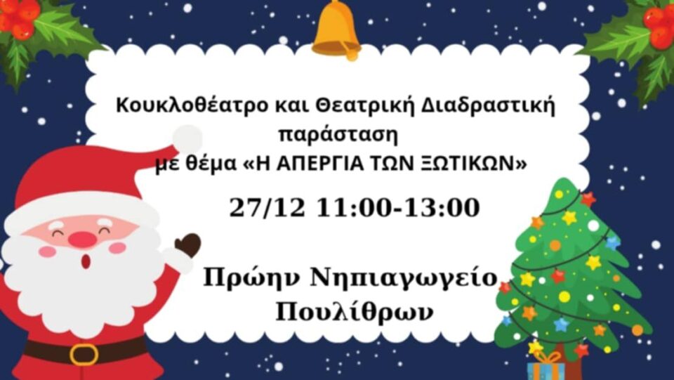 Μια ξεχωριστή γιορτινή δράση για τους μικρούς μας φίλους πραγματοποιείται σήμερα, Παρασκευή 27 Δεκεμβρίου, στις 11:00 το πρωί, στα Πούλιθρα, με κουκλοθέατρο και τη διαδραστική θεατρική παράσταση «Η Απεργία των ξωτικών».