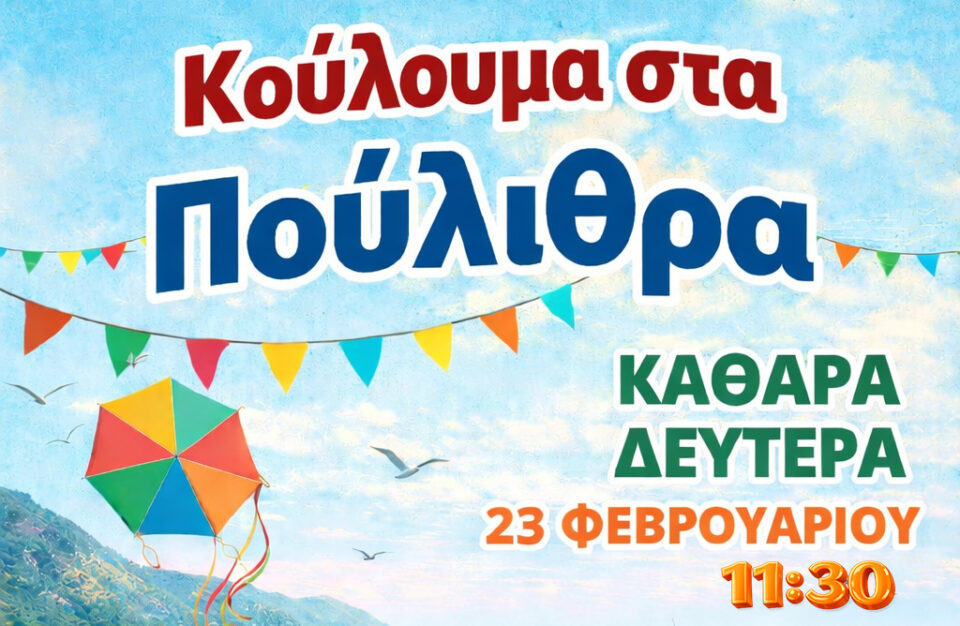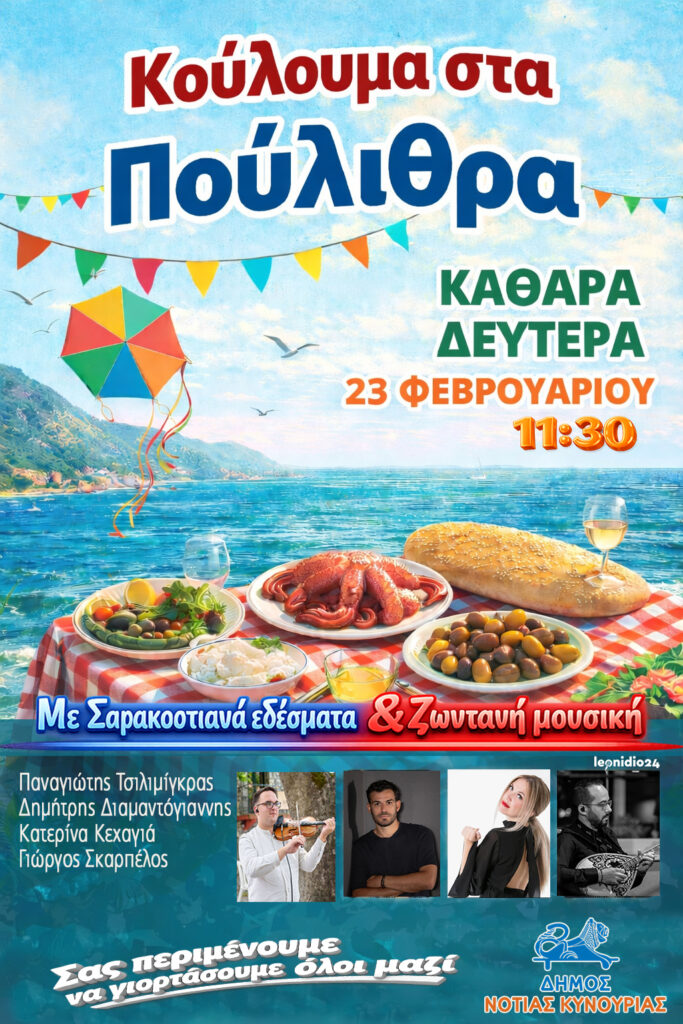 Ο Δήμος Νότιας Κυνουρίας διοργανώνει τα Κούλουμα στα Πούλιθρα την Καθαρά Δευτέρα 23 Φεβρουαρίου στις 11:30, προσκαλώντας κατοίκους και επισκέπτες σε μια γιορτή δίπλα στη θάλασσα.