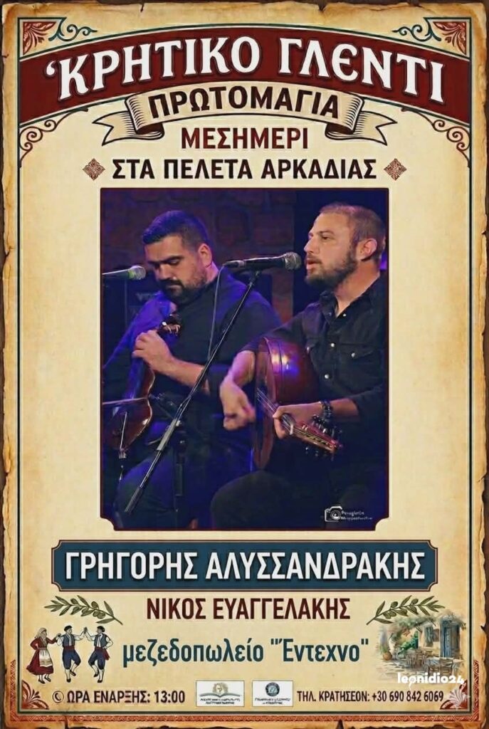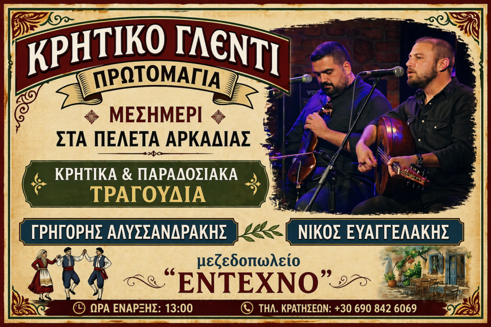 Κρητικό γλέντι θα γίνει την Πρωτομαγιά, το μεσημέρι, στα Πελετά Αρκαδίας, στο μεζεδοπωλείο «Έντεχνο».