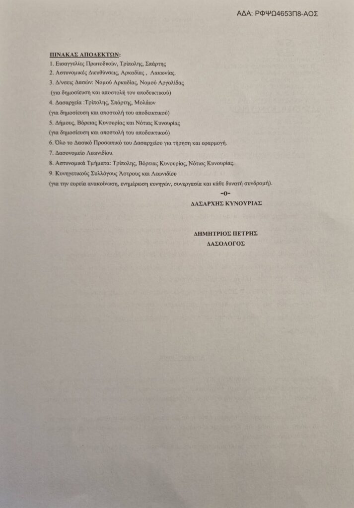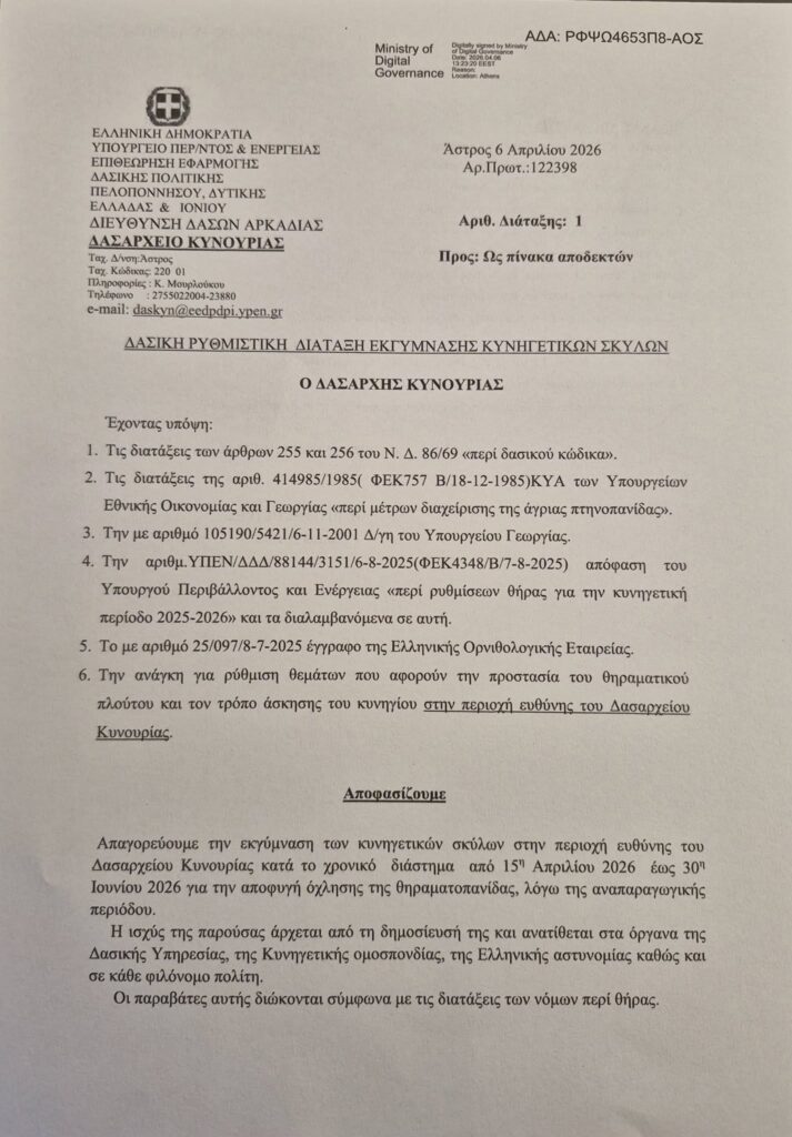 Σε ισχύ τίθεται από τις 15 Απριλίου έως και τις 30 Ιουνίου 2026 η απαγόρευση εκγύμνασης κυνηγετικών σκύλων στην περιοχή ευθύνης του Δασαρχείου Κυνουρίας, σύμφωνα με σχετική δασική ρυθμιστική διάταξη.