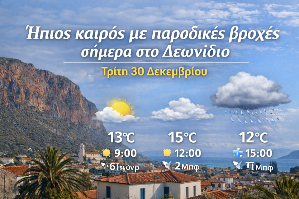 Με γενικά ήπιες καιρικές συνθήκες θα κυλήσει σήμερα, Τρίτη 30 Δεκεμβρίου, ο καιρός στο Λεωνίδιο, με παροδική μεταβολή κατά τις απογευματινές ώρες.